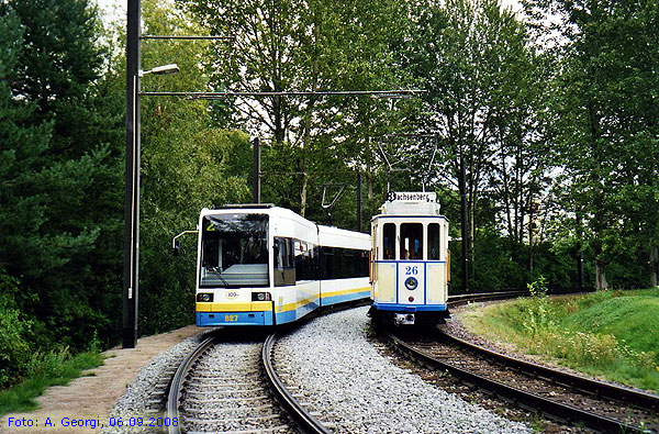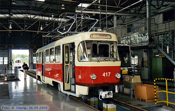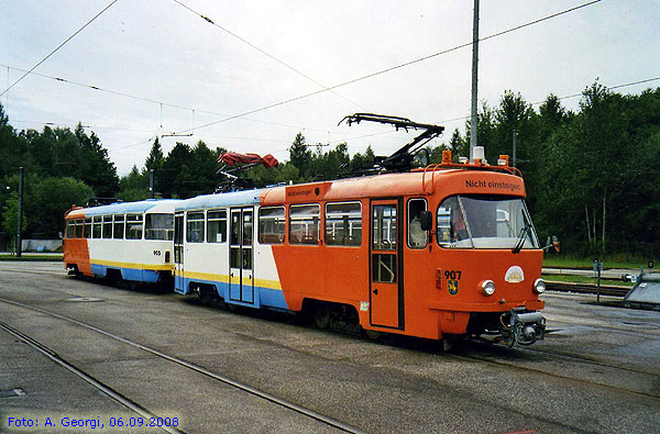 der Tatra-Tw 418 mit Bw 359, sowie der Werkstattzug Tw 905 +